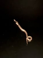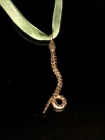 The serpent charm is hand sculptured in wax, cast into metal, and finished by hand.