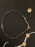 A snake chasing a flower that it can never reach threaded on a single row of reclaimed midnight-coloured pearls. The pearls originally came from a vintage necklace. The flower charm was originally intended to be a button. And the snake was an experiment on an existing mould. All three came together to make something new.